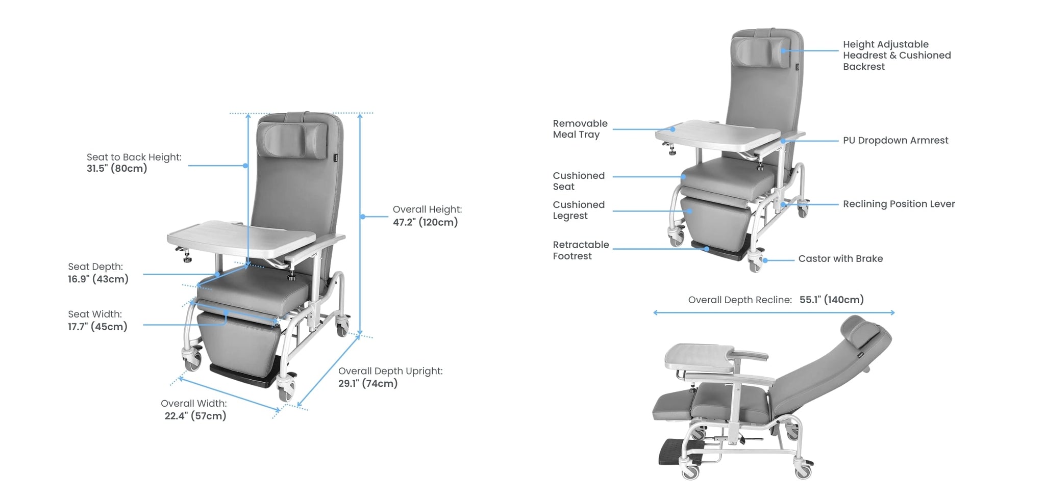 The geriatric chair reclines beyond 150°, allowing users to nap comfortably whenever they wish. Thoughtfully designed for convenience, it includes a stowable meal tray, ensuring a clutter-free space when not in use.