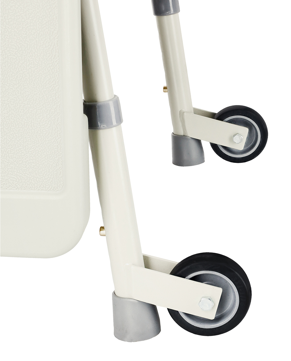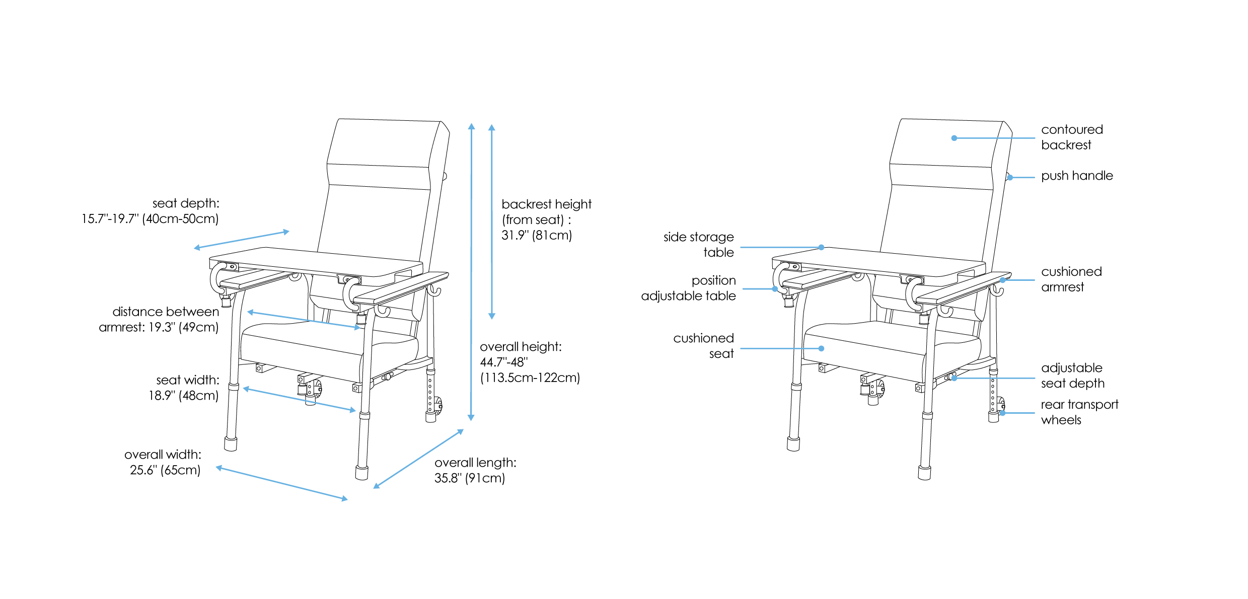Rear transport wheels provide mobility when moving the chair.