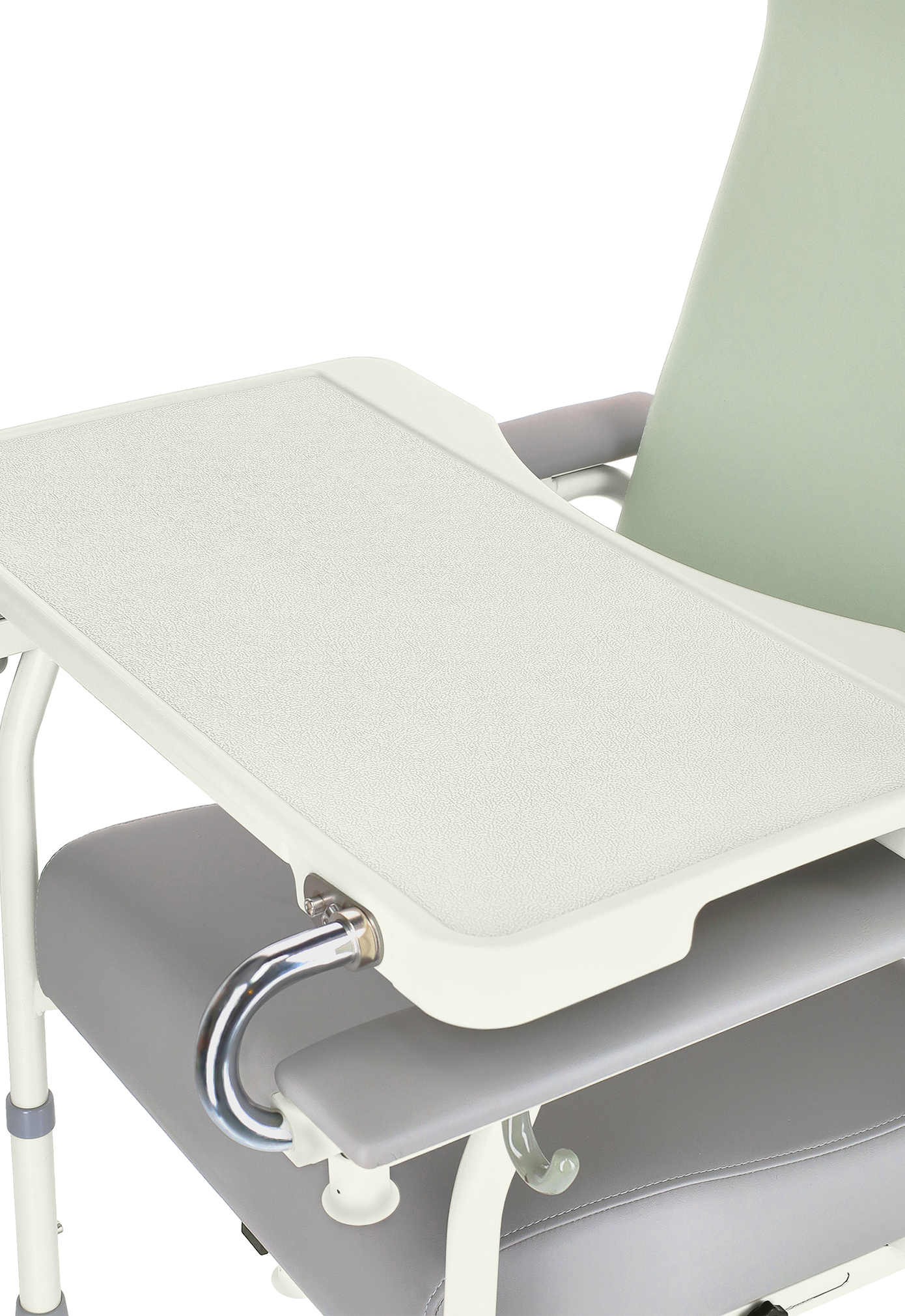 The table can be stored conveniently at the side of the chair when not in use.